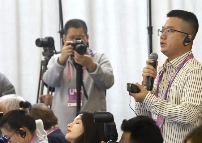 王君寶在第九屆亞冬會新聞發布會采訪現場提問。